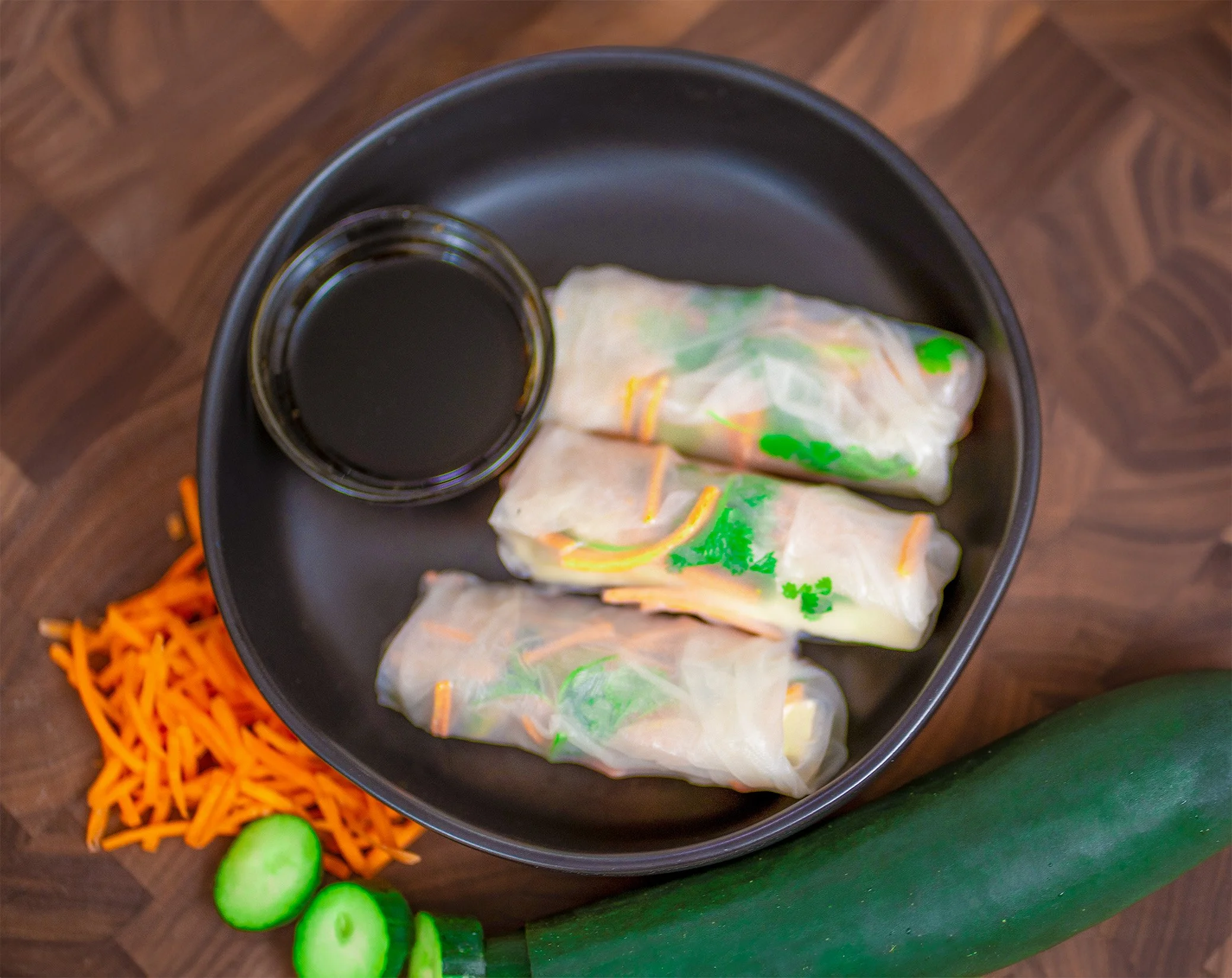 Fold in the sides of each rice paper wrap, then tuck and roll tightly to close. Repeat for all 3 wraps.